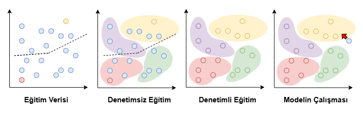 Yukarıdaki görsel de bu süreci adım adım yansıtmaktadır. İlk panelde yalnızca birkaç örneğin etiketli, geri kalan çoğunluğun ise etiketsiz olduğu görülür. İkinci panelde model, etiketsiz verinin doğal yapısını fark ederek veriyi kümelere ayırır; bu adım tamamen denetimsiz öğrenmenin gücünü kullanır. Üçüncü panelde bu kümelerdeki az sayıdaki etiketli veri devreye girer ve model, her grubun özelliklerini daha doğru şekilde öğrenir. Son panelde ise yeni bir veri noktası sisteme eklenir ve model hem kümelerin genel yapısını hem de mevcut etiketli örnekleri kullanarak bu veriyi doğru sınıfa yerleştirir.